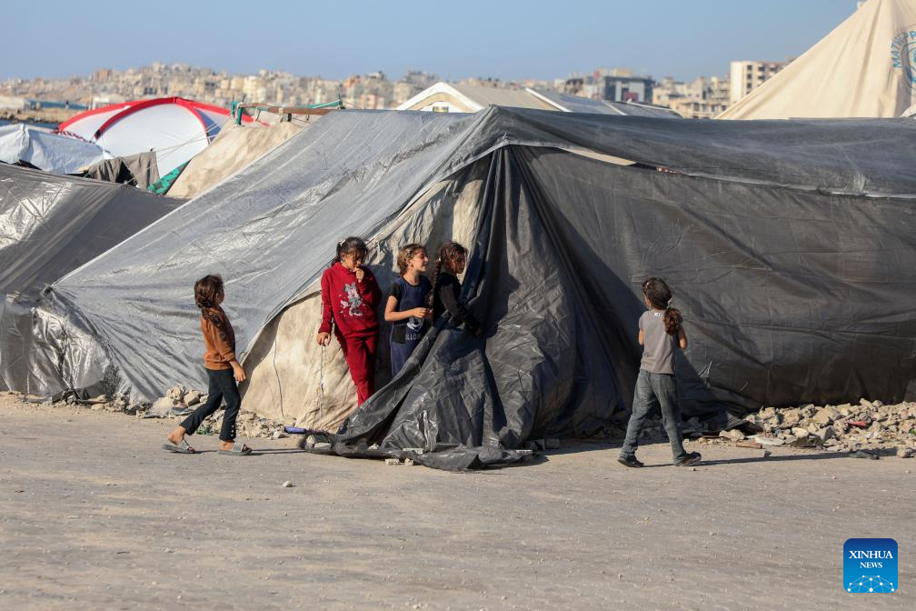 Displaced children are seen in the seaport area of western Gaza City, on May 21, 2025. Palestinian President Mahmoud Abbas on Wednesday called on the international community to take immediate action in response to the "catastrophic and tragic" situation in the Gaza Strip. (Photo by Rizek Abdeljawad/Xinhua)