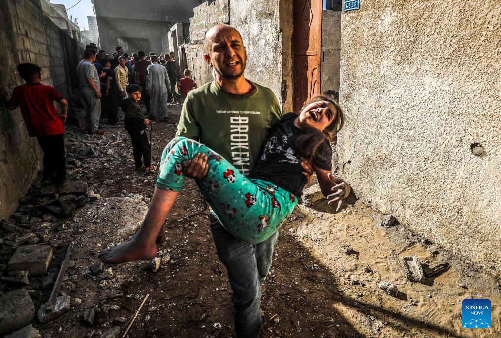 A man holds an injured girl for help after an Israeli airstrike in the Jabalia refugee camp, northern Gaza Strip, May 21, 2025. Mahmoud Basal, spokesperson for Gaza's Civil Defense, told Xinhua on Wednesday that Israeli aircraft launched dozens of raids on Gaza since dawn, killing at least 56 Palestinians across the territory. (Photo by Mahmoud Zaki/Xinhua)