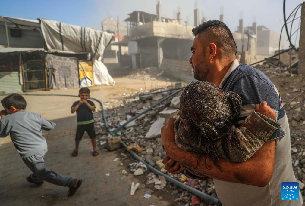 A man holds an injured child for help after an Israeli airstrike in the Jabalia refugee camp, northern Gaza Strip, May 21, 2025. Mahmoud Basal, spokesperson for Gaza's Civil Defense, told Xinhua on Wednesday that Israeli aircraft launched dozens of raids on Gaza since dawn, killing at least 56 Palestinians across the territory. (Photo by Mahmoud Zaki/Xinhua)