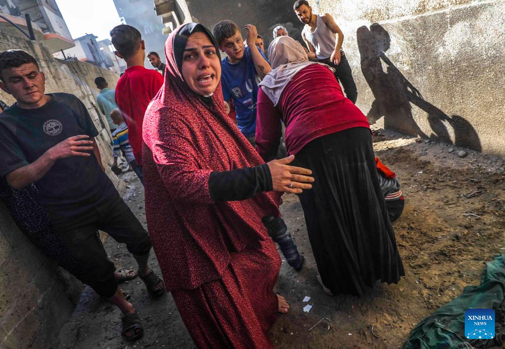 Palestinians react after an Israeli airstrike in the Jabalia refugee camp, northern Gaza Strip, May 21, 2025. Mahmoud Basal, spokesperson for Gaza's Civil Defense, told Xinhua on Wednesday that Israeli aircraft launched dozens of raids on Gaza since dawn, killing at least 56 Palestinians across the territory. (Photo by Mahmoud Zaki/Xinhua)