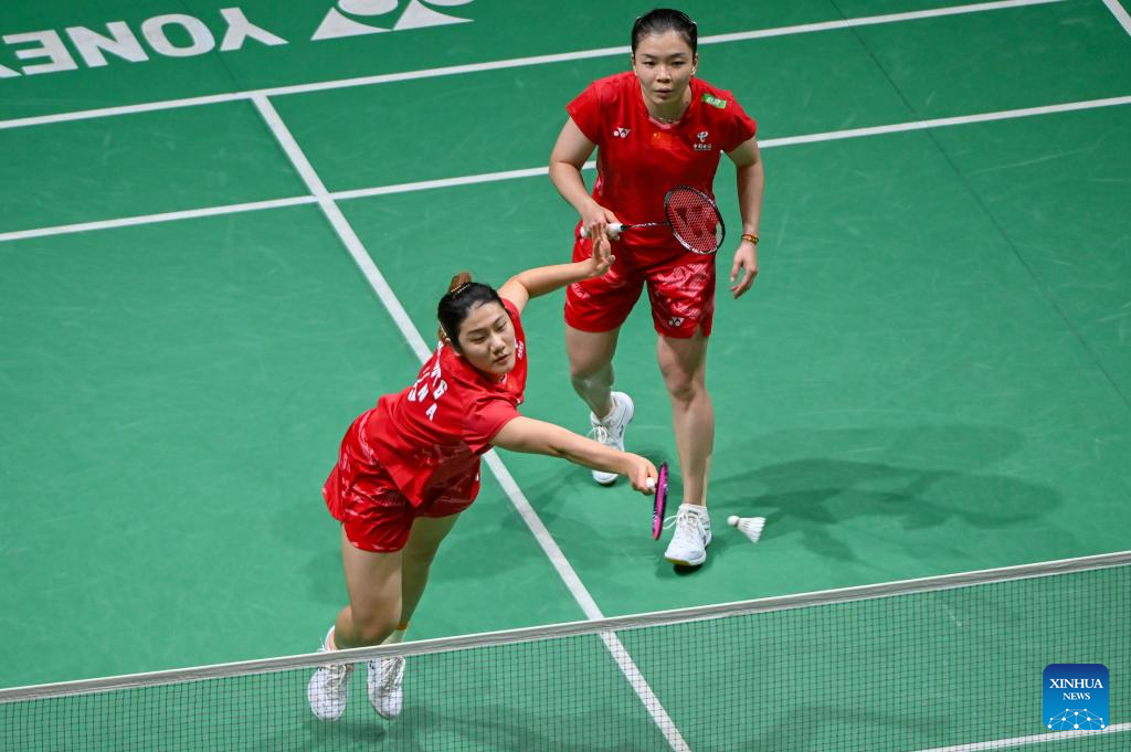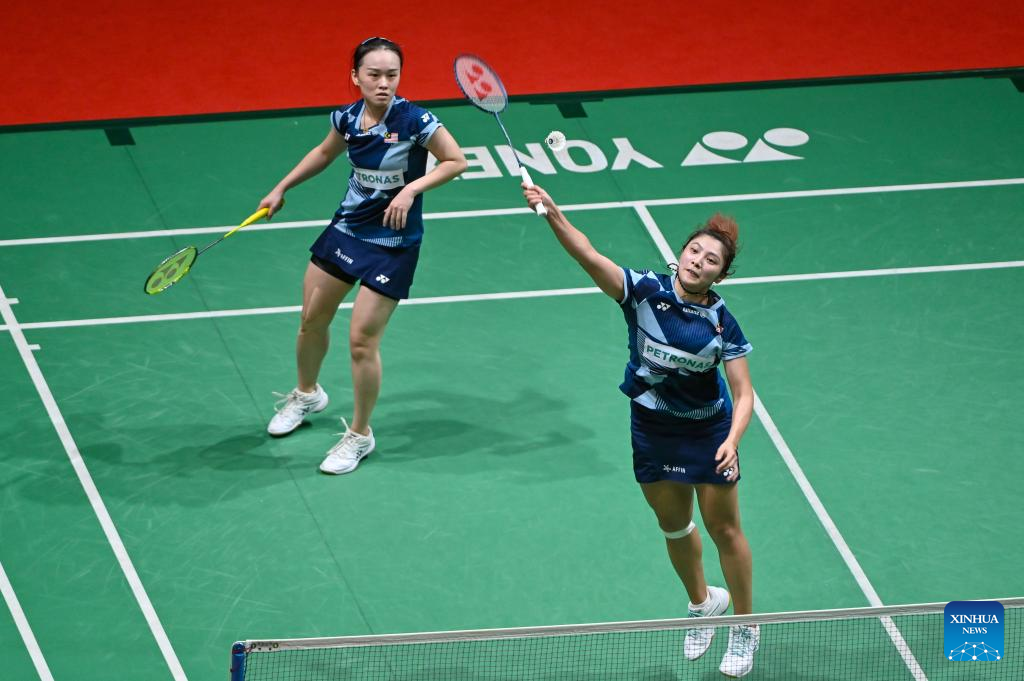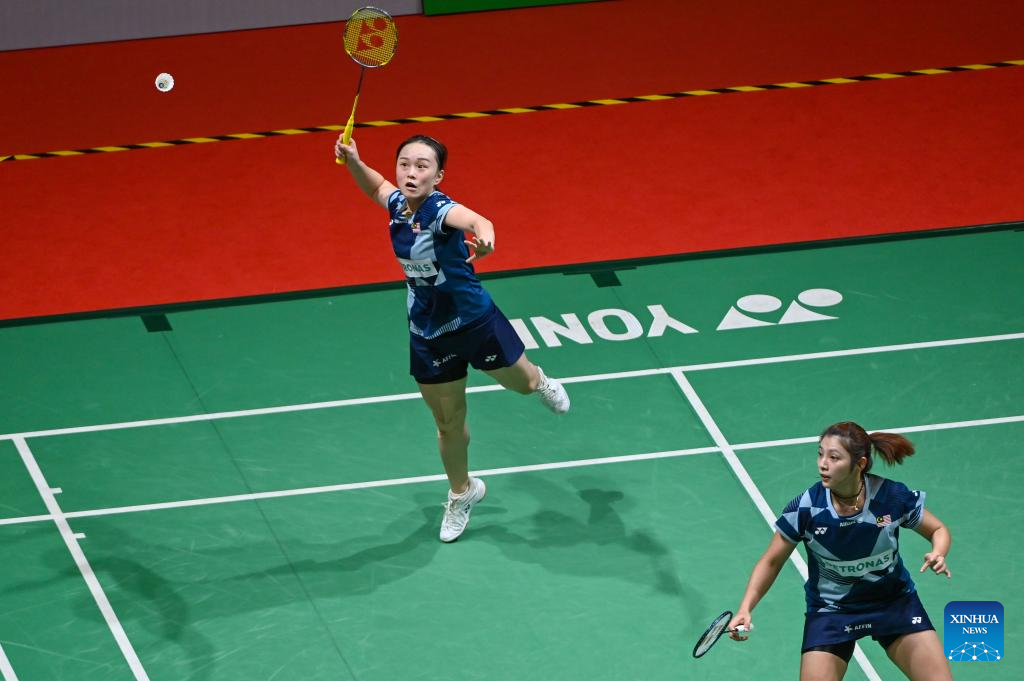 Chen Qingchen (L)/Wang Tingge compete during the women's doubles round of 32 match between Chen Qingchen/Wang Tingge of China and Go Pei Kee/Teoh Mei Xing of Malaysia at 2025 Malaysia Masters badminton tournament in Kuala Lumpur, Malaysia, May 20, 2025. (Photo by Chong Voon Chung/Xinhua)
