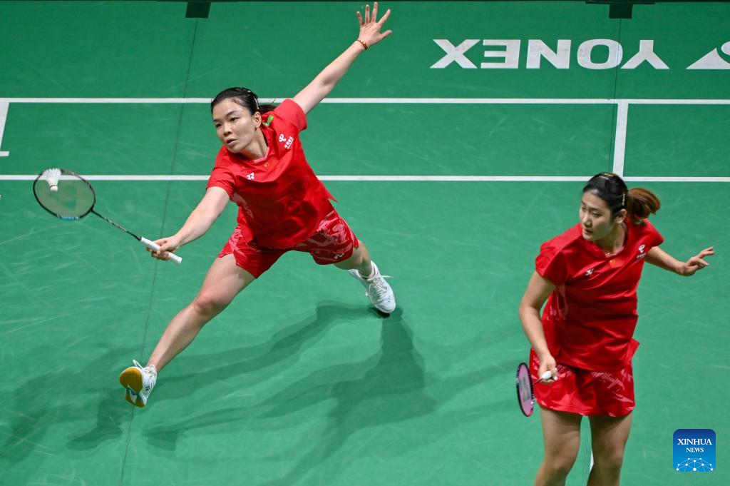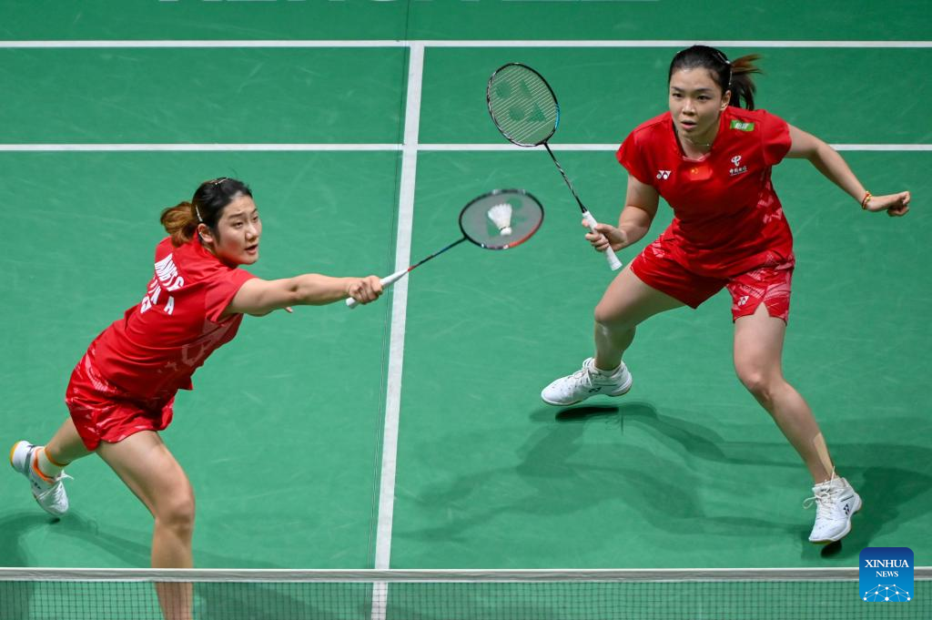 Chen Qingchen/Wang Tingge (L) compete during the women's doubles round of 32 match between Chen Qingchen/Wang Tingge of China and Go Pei Kee/Teoh Mei Xing of Malaysia at 2025 Malaysia Masters badminton tournament in Kuala Lumpur, Malaysia, May 20, 2025. (Photo by Chong Voon Chung/Xinhua)