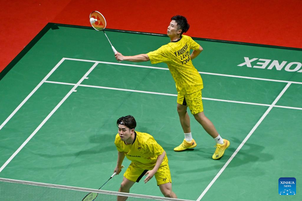 Hoki Takuro/Kobayashi Yugo (R) compete during the men's doubles round of 32 match between Huang Di/Liu Yang of China and Hoki Takuro/Kobayashi Yugo of Japan at 2025 Malaysia Masters badminton tournament in Kuala Lumpur, Malaysia, May 20, 2025. (Photo by Chong Voon Chung/Xinhua)