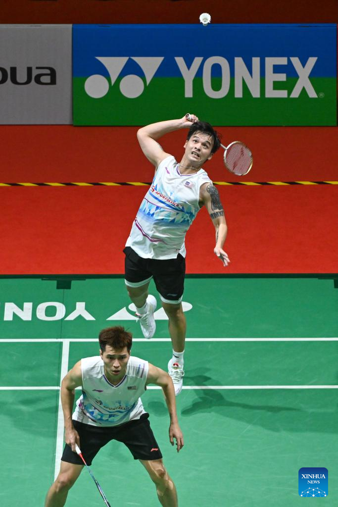 Ong Yew Sin/Teo Ee Yi (R) compete during the men's doubles round of 32 match between Ong Yew Sin/Teo Ee Yi of Malaysia and Liang Weikeng/Wang Chang of China at 2025 Malaysia Masters badminton tournament in Kuala Lumpur, Malaysia, May 20, 2025. (Photo by Chong Voon Chung/Xinhua)