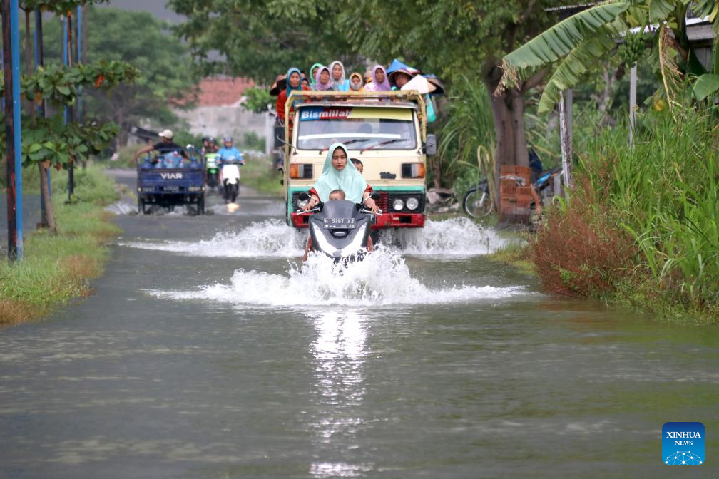 People travel through flood water after heavy rain and overflow of the Tuntang river at Sumberejo village in Demak Regency, Central Java, Indonesia, May 21, 2025. (Photo by Kalila/Xinhua)