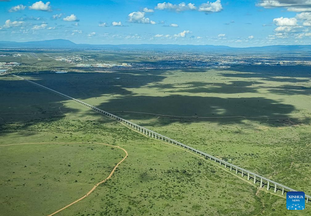 Photo taken on May 16, 2025 shows a viaduct of the Nairobi-Malaba Standard Gauge Railway traversing Nairobi National Park in Kenya. Constructed by China Road and Bridge Corporation (CRBC), the Nairobi-Malaba Standard Gauge Railway is a key component of the Kenya Standard Gauge Railway Project with a total length of about 960 km upon completion. According to Yu Fujia, assistant general manager of CRBC's Kenya operations, the Nairobi-Malaba railway incorporates 14 ground-level wildlife crossings, 150 underground culverts, and six km of noise-dampening overpasses with light-permeable barriers, forming a three-dimensional corridor for animals. (Xinhua/Li Yahui)