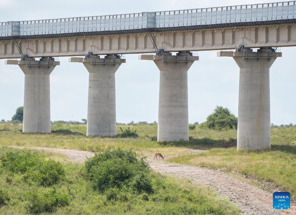 NAIROBI, May 21 (Xinhua) -- As dawn breaks over Kenya's savannah, a herd of giraffes ambles beneath the 7.5-meter-high arches of the Nairobi-Malaba Standard Gauge Railway bridge, purposefully engineered to accommodate their towering frames.