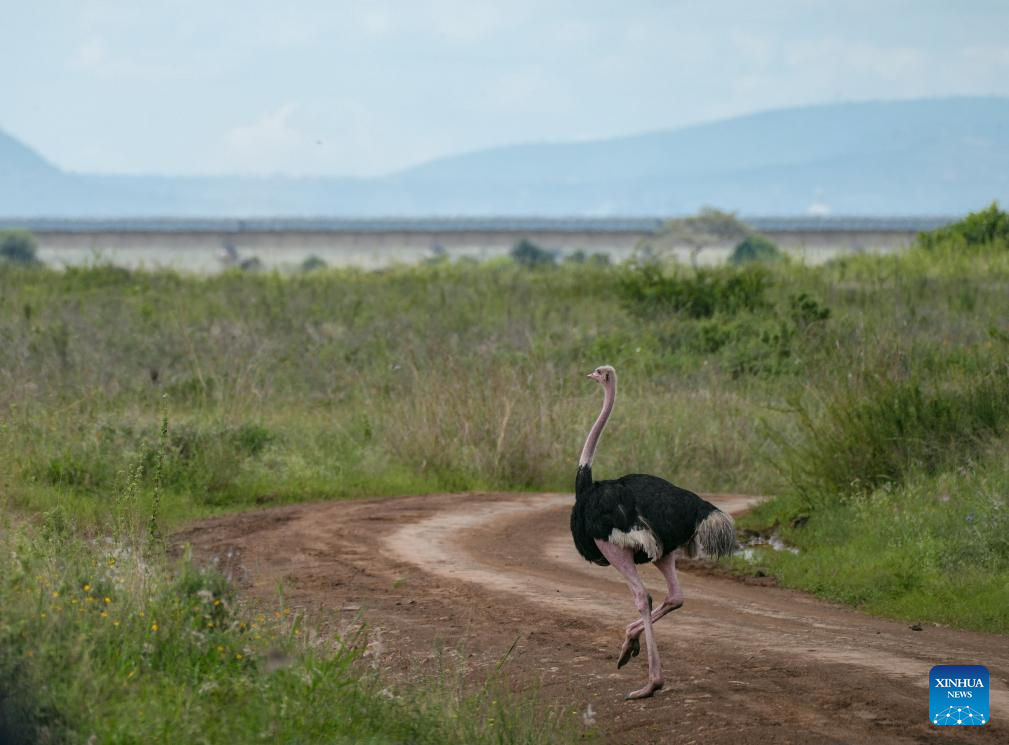An ostrich is pictured with a viaduct of the Nairobi-Malaba Standard Gauge Railway in the background in Nairobi National Park, Kenya, on May 16, 2025. Constructed by China Road and Bridge Corporation (CRBC), the Nairobi-Malaba Standard Gauge Railway is a key component of the Kenya Standard Gauge Railway Project with a total length of about 960 km upon completion. According to Yu Fujia, assistant general manager of CRBC's Kenya operations, the Nairobi-Malaba railway incorporates 14 ground-level wildlife crossings, 150 underground culverts, and six km of noise-dampening overpasses with light-permeable barriers, forming a three-dimensional corridor for animals. (Xinhua/Li Yahui)