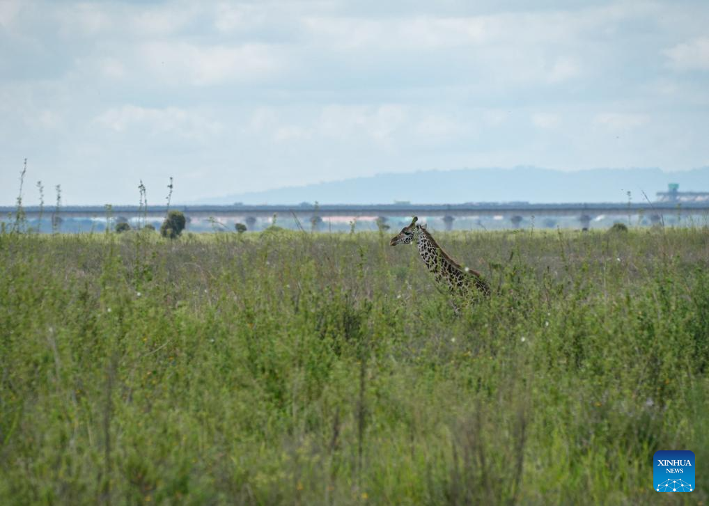 A giraffe is pictured with a viaduct of the Nairobi-Malaba Standard Gauge Railway in the background in Nairobi National Park, Kenya, on May 16, 2025. Constructed by China Road and Bridge Corporation (CRBC), the Nairobi-Malaba Standard Gauge Railway is a key component of the Kenya Standard Gauge Railway Project with a total length of about 960 km upon completion. According to Yu Fujia, assistant general manager of CRBC's Kenya operations, the Nairobi-Malaba railway incorporates 14 ground-level wildlife crossings, 150 underground culverts, and six km of noise-dampening overpasses with light-permeable barriers, forming a three-dimensional corridor for animals. (Xinhua/Li Yahui)
