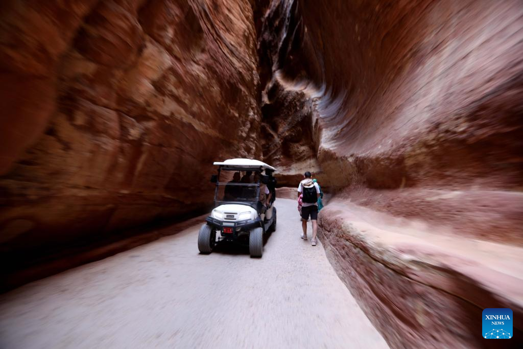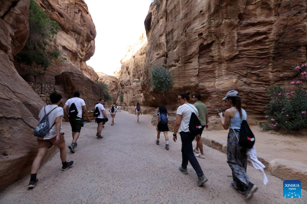 Tourists walk at the archaeological site of Petra, Jordan, on May 20, 2025. Jordan's Petra is a unique archaeological Nabataean city carved into rock, recognized as a UNESCO World Heritage Site since 1985. (Photo by Mohammad Abu Ghosh/Xinhua)