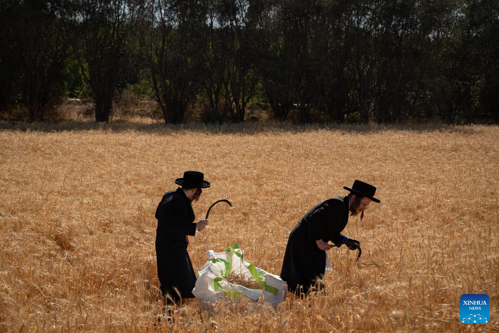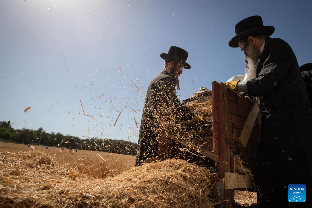 Ultra-Orthodox Jews harvest wheat as part of an annual ritual ahead of the Jewish holiday of Shavuot, in a field near Jerusalem on May 20, 2025. (Xinhua/Chen Junqing)