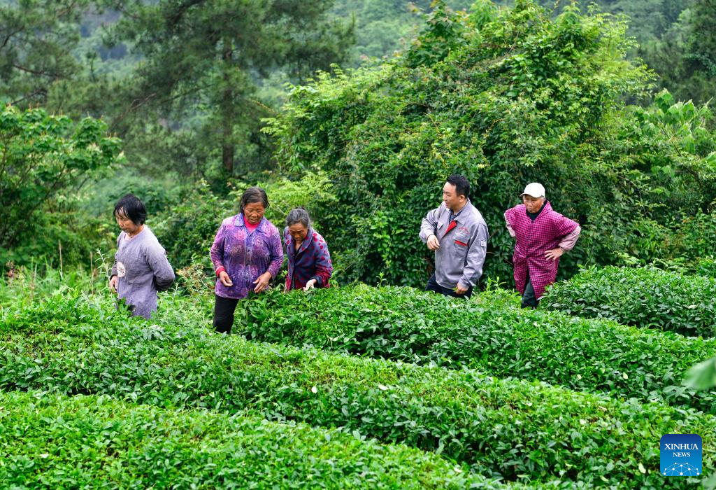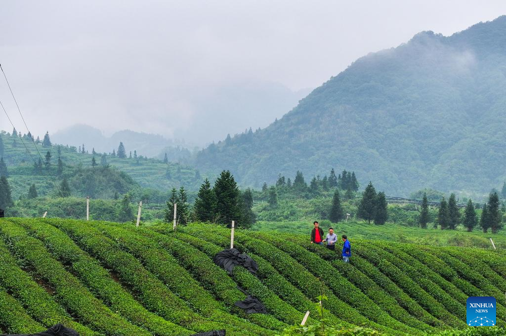 Tea farmers work at a tea garden in Jiangkou County, southwest China's Guizhou Province, May 15, 2025.