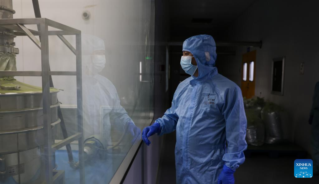 Wei Yong checks the condition of a matcha production line inside a workshop in Jiangkou County, southwest China's Guizhou Province, May 14, 2025.