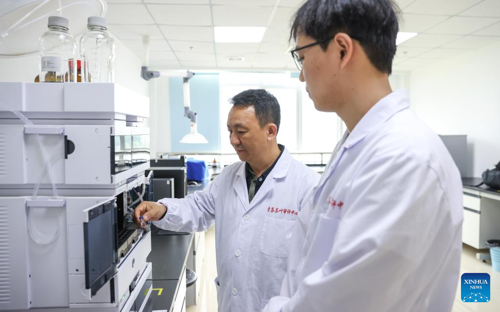 Wei Yong (L) tests a matcha sample with a colleague in Jiangkou County, southwest China's Guizhou Province, May 14, 2025.