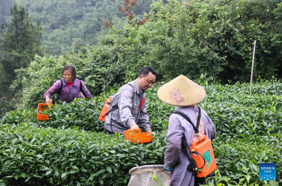Wei Yong (C) harvests tea leaves with villagers in Jiangkou County, southwest China's Guizhou Province, May 15, 2025.