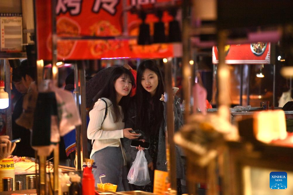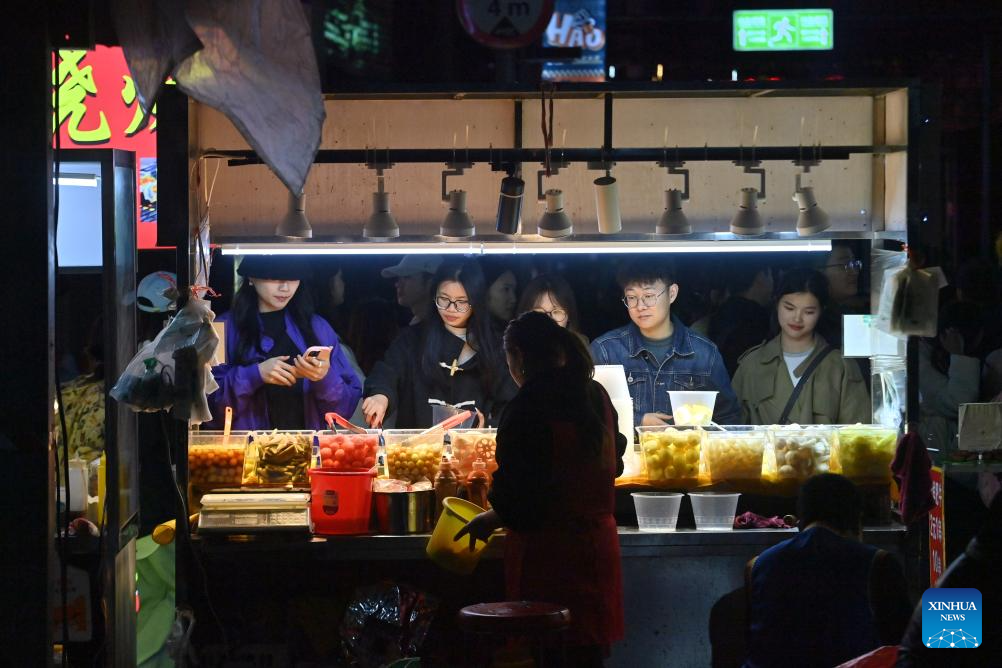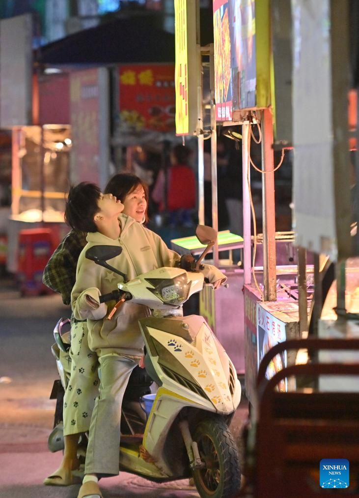 People buy snacks at the Xiguan night market in Nanning, south China's Guangxi Zhuang Autonomous Region, March 29, 2025. Nighttime economy refers to business activities between 6 p.m. and 6 a.m. In recent years, Nanning has been continuously focusing on the upgrade of consumption experience and promoting the integration of cultural tourism and commerce. Various night fairs and booths across the city have boosted consumption and injected vitality into the city's night economy. (Xinhua/Huang Xiaobang)