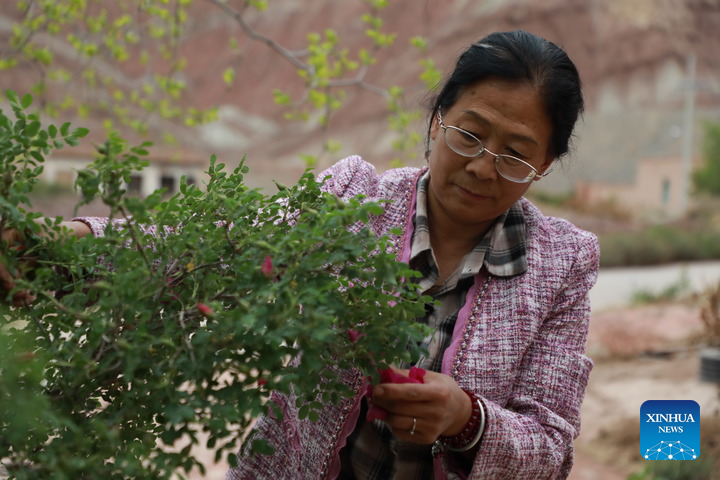 LANZHOU, May 22 (Xinhua) -- Nestled in the barren Loess Plateau, the small town of Kushui in northwest China's Gansu Province bursts into a sea of vibrant roses every mid-May.