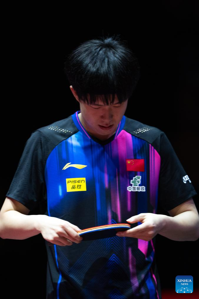 Wang Chuqin checks his racket before the mixed doubles round of 32 match between Wang Chuqin/Sun Yingsha of China and Hugo Calderano/Bruna Takahashi of Brazil at ITTF World Table Tennis Championships Finals Doha 2025 in Doha, Qatar, May 19, 2025. (Xinhua/Xiao Yijiu)
