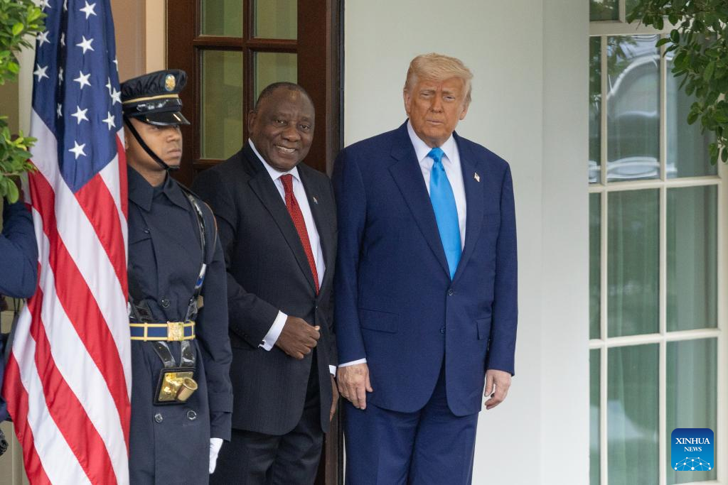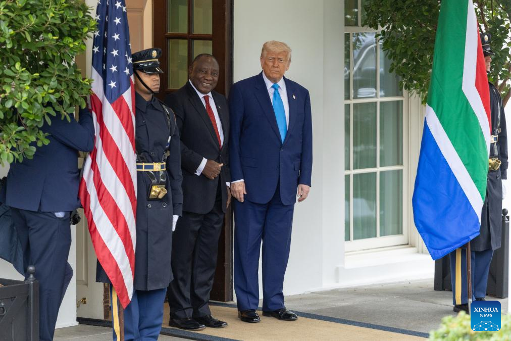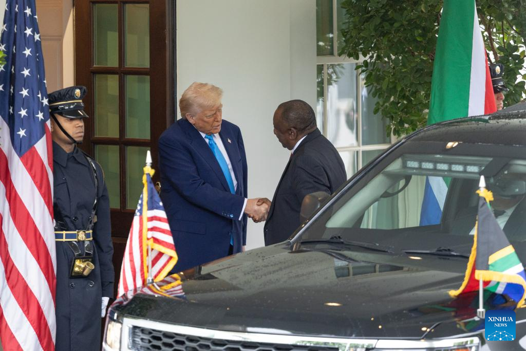 U.S. President Donald Trump (R) greets visiting South African President Cyril Ramaphosa (C) at the White House in Washington, D.C., the United States, on May 21, 2025. U.S. President Donald Trump confronted visiting South African President Cyril Ramaphosa on Wednesday with conspiracy theories on "white genocide" in South Africa, which Ramaphosa firmly denied. (Xinhua/Hu Yousong)