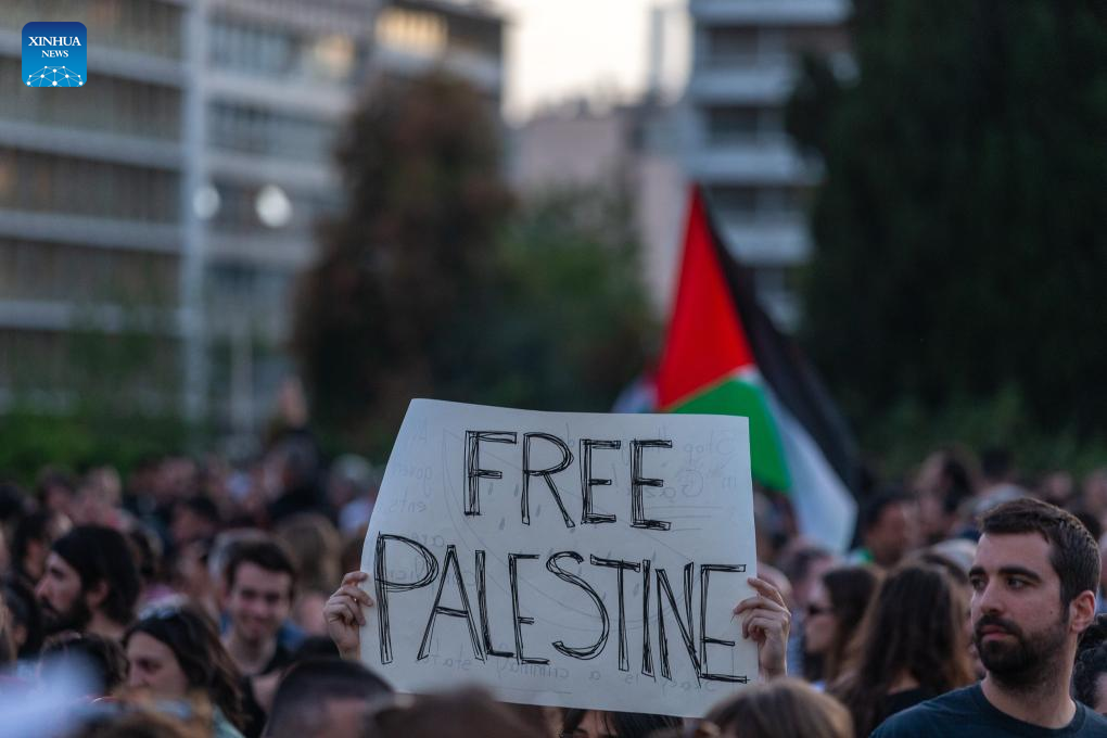 ATHENS, May 21 (Xinhua) -- Thousands of people took to the streets of Athens, Greece, on Wednesday to protest Israel's latest military offensive in the Gaza Strip and the worsening humanitarian crisis resulting from the ongoing blockade.