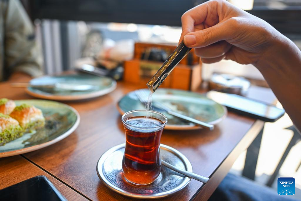 A customer adds sugar to black tea at a teahouse in Istanbul, Türkiye, May 21, 2025. (Xinhua/Liu Lei)