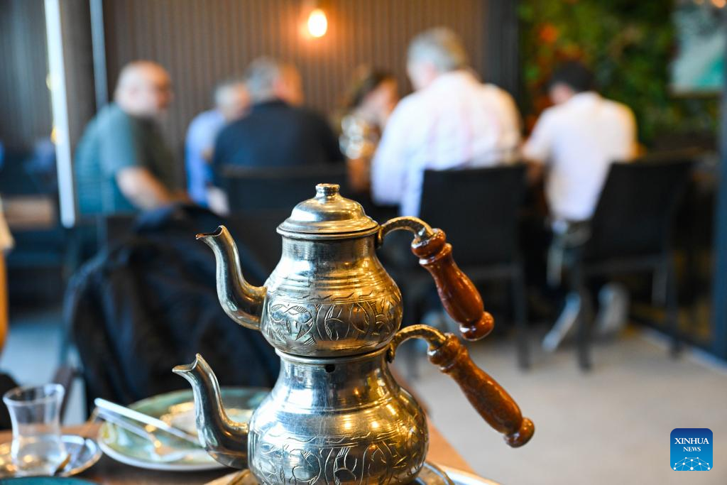A staff member prepares to serve tea to customers at a teahouse in Istanbul, Türkiye, May 21, 2025. (Xinhua/Liu Lei)