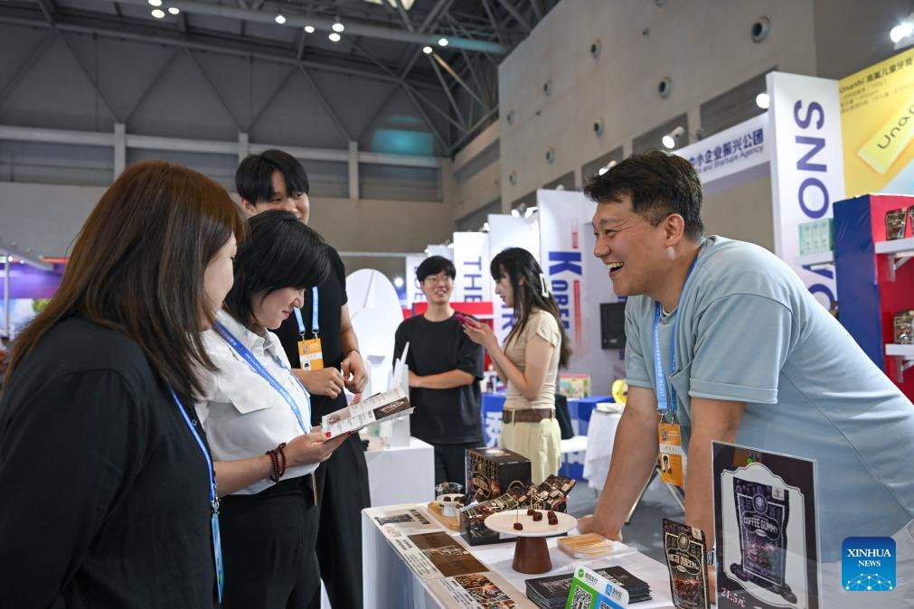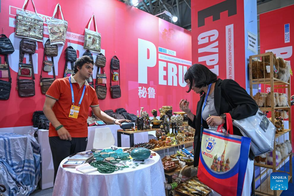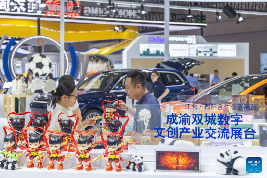 Visitors inquire about cultural and creative products during the 7th Western China International Fair for Investment and Trade in southwest China's Chongqing Municipality, May 22, 2025. With on-site project agreements exceeding 200 billion yuan (about 27.8 billion U.S. dollars), the fair kicked off in Chongqing on Thursday, attracting over 1,300 enterprises from 39 countries and regions. (Xinhua/Huang Wei)