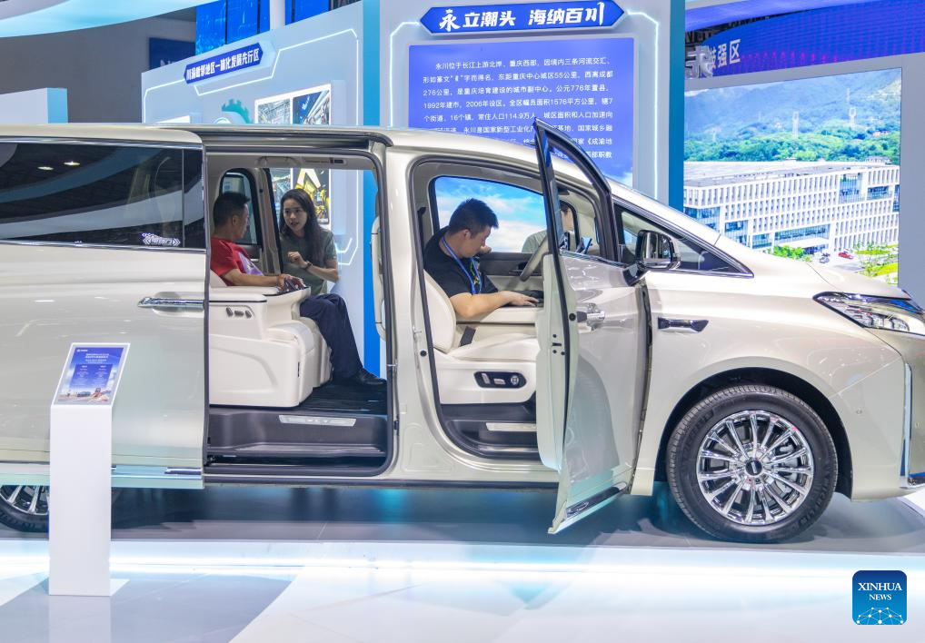 Visitors experience a new energy vehicle during the 7th Western China International Fair for Investment and Trade in southwest China's Chongqing Municipality, May 22, 2025. With on-site project agreements exceeding 200 billion yuan (about 27.8 billion U.S. dollars), the fair kicked off in Chongqing on Thursday, attracting over 1,300 enterprises from 39 countries and regions. (Xinhua/Huang Wei)