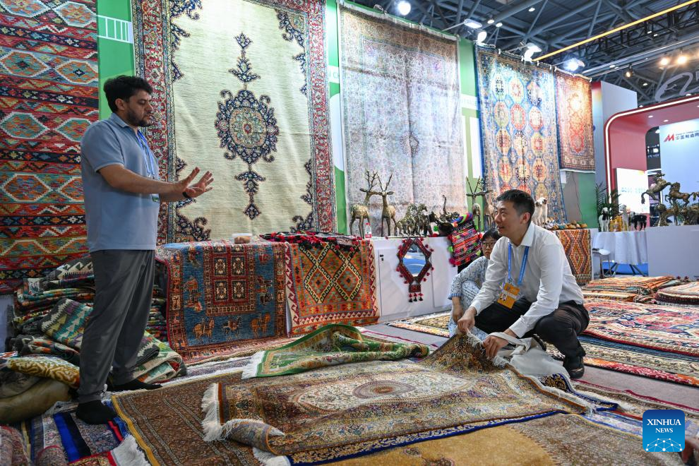 A carpet merchant from Afghanistan introduces his products during the 7th Western China International Fair for Investment and Trade in southwest China's Chongqing Municipality, May 22, 2025. With on-site project agreements exceeding 200 billion yuan (about 27.8 billion U.S. dollars), the fair kicked off in Chongqing on Thursday, attracting over 1,300 enterprises from 39 countries and regions. (Xinhua/Chen Cheng)