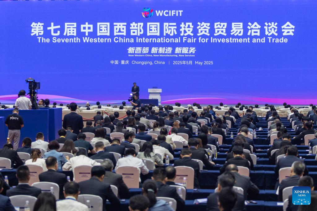 This photo taken on May 22, 2025 shows the opening ceremony of the 7th Western China International Fair for Investment and Trade in southwest China's Chongqing Municipality. With on-site project agreements exceeding 200 billion yuan (about 27.8 billion U.S. dollars), the fair kicked off in Chongqing on Thursday, attracting over 1,300 enterprises from 39 countries and regions. (Xinhua/Huang Wei)
