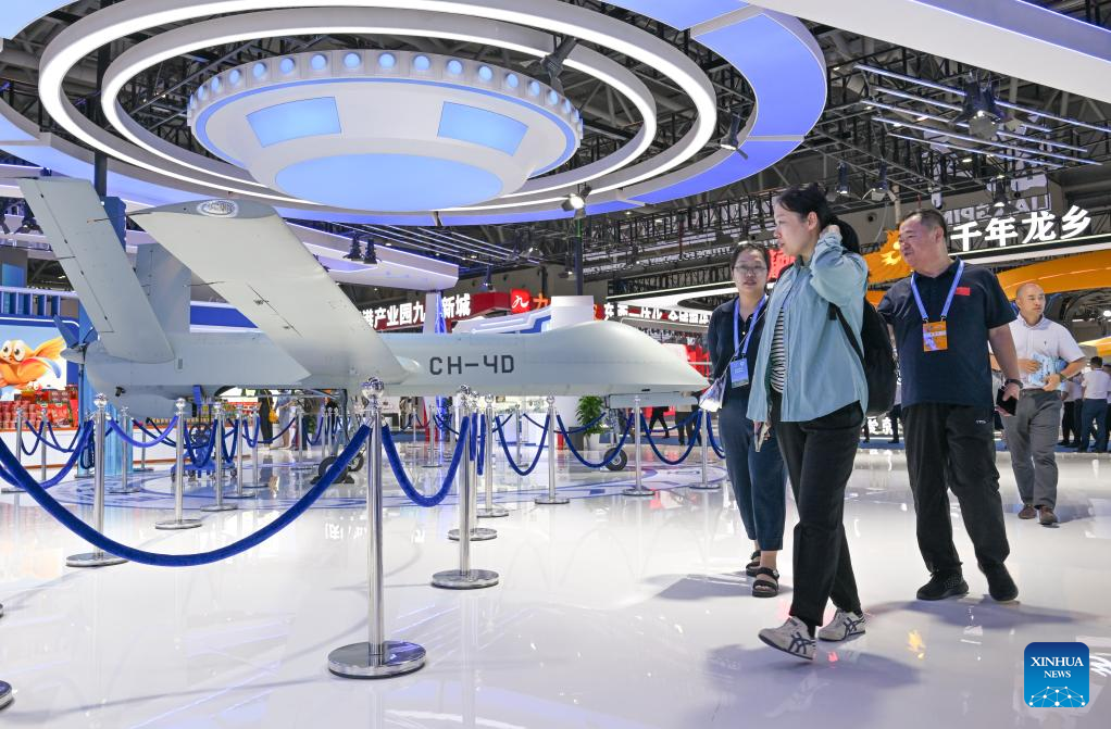 Visitors look at an unmanned aerial vehicle during the 7th Western China International Fair for Investment and Trade in southwest China's Chongqing Municipality, May 22, 2025. The fair kicked off in Chongqing on Thursday, attracting over 1,300 enterprises from 39 countries and regions. (Xinhua/Chen Cheng)