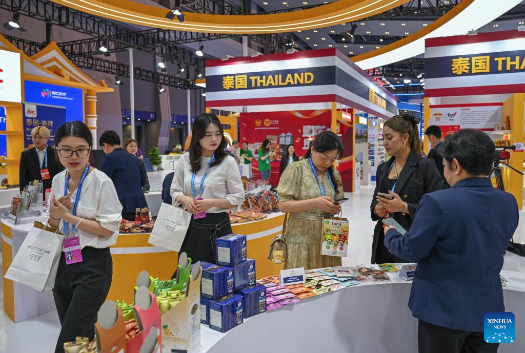People visit the pavilion of Thailand, the guest country of honor, during the 7th Western China International Fair for Investment and Trade in southwest China's Chongqing Municipality, May 22, 2025. The fair kicked off in Chongqing on Thursday, attracting over 1,300 enterprises from 39 countries and regions. (Xinhua/Chen Cheng)