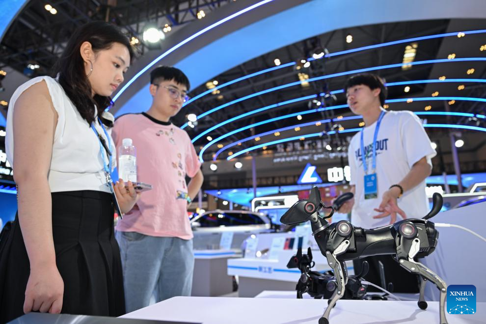 Visitors learn about Sirius, an intelligent four-legged robot, during the 7th Western China International Fair for Investment and Trade in southwest China's Chongqing Municipality, May 22, 2025. With on-site project agreements exceeding 200 billion yuan (about 27.8 billion U.S. dollars), the fair kicked off in Chongqing on Thursday, attracting over 1,300 enterprises from 39 countries and regions. (Xinhua/Chen Cheng)