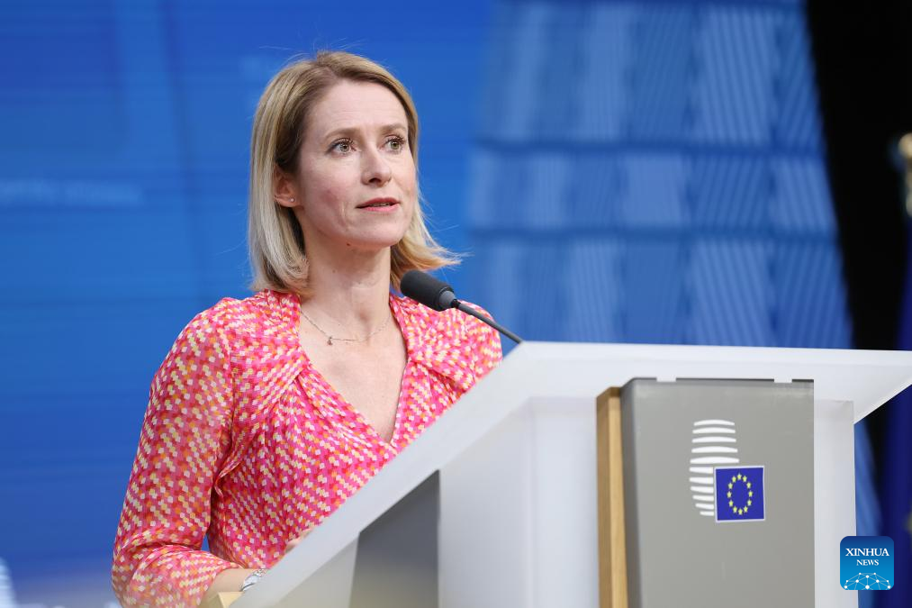 EU foreign policy chief Kaja Kallas speaks during a press conference in Brussels, Belgium, May 20, 2025. Following a meeting of the bloc's foreign ministers, EU foreign policy chief Kaja Kallas said that there is a "strong majority" in favour of reviewing Article 2 of the EU-Israel Association Agreement, which has been in force since 2000, and stipulates that cooperation must be based on "respect for human rights." (European Union/Handout via Xinhua)