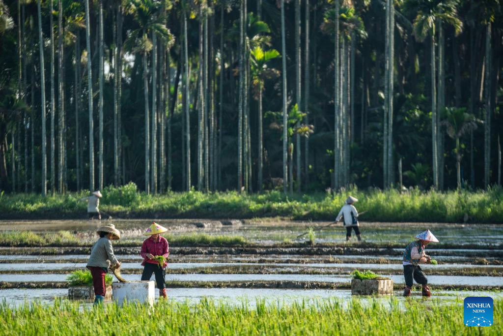 Farmers transplant seedlings in a paddy rice field in Jiaji Town of Qionghai City, south China's Hainan Province, May 21, 2025. The traditional Chinese solar term Xiaoman (Grain Buds) falls on May 21 this year, indicating that grain seeds are becoming full. (Photo by Meng Zhongde/Xinhua)