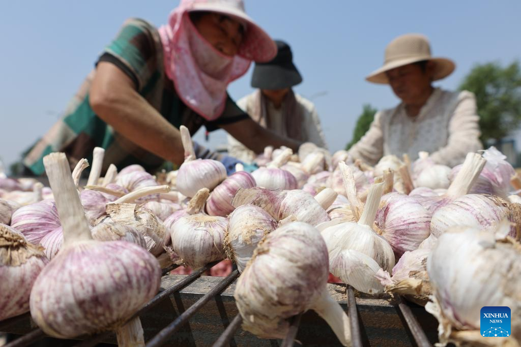 Farmers sorts and pack garlic in Kaifeng City, central China's Henan Province, May 21, 2025. The traditional Chinese solar term Xiaoman (Grain Buds) falls on May 21 this year, indicating that grain seeds are becoming full. (Photo by Shi Fei/Xinhua)
