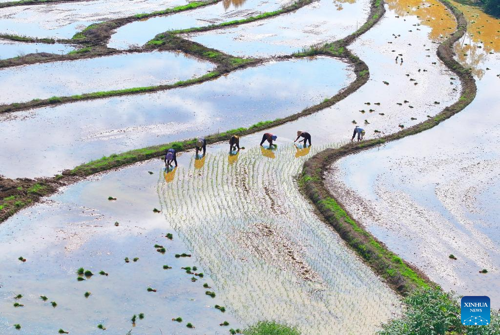 Farmers transplant rice seedlings at the paddy fields in Jinning District of Kunming City, southwest China's Yunnan Province, May 21, 2025. The traditional Chinese solar term Xiaoman (Grain Buds) falls on May 21 this year, indicating that grain seeds are becoming full. (Photo by Song Guangxu/Xinhua)