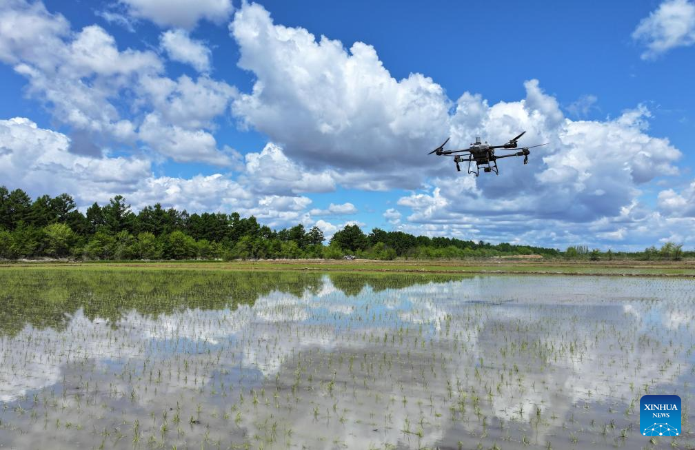 A crop protection drone applies fertilizer over a paddy rice field of a farming company under the Beidahuang Group's branch in northeast China's Heilongjiang Province, May 21, 2025. The traditional Chinese solar term Xiaoman (Grain Buds) falls on May 21 this year, indicating that grain seeds are becoming full. (Photo by Li Xing/Xinhua)