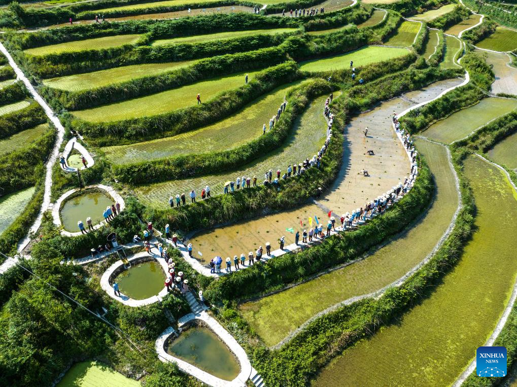 An aerial photo taken on May 21, 2025 shows farmers competing during a seedling transplanting competition in Lianghekou Town of Zigui County, Yichang City of central China's Hubei Province. The traditional Chinese solar term Xiaoman (Grain Buds) falls on May 21 this year, indicating that grain seeds are becoming full. (Photo by Wang Gang/Xinhua)