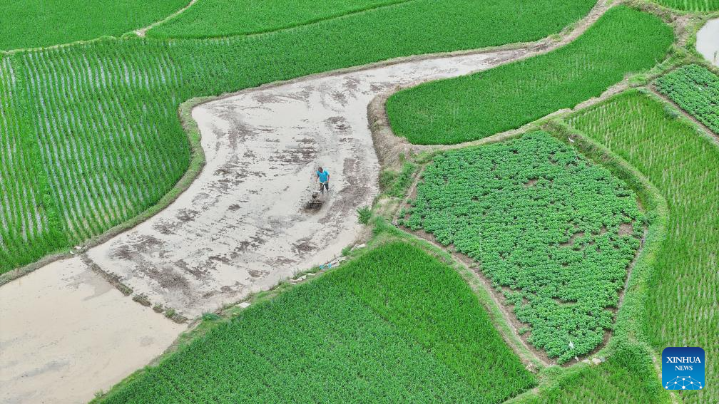 An aerial drone photo taken on May 21, 2025 shows farmers plowing the farmland in Baimadu Town of Daoxian County in Yongzhou City, central China's Hunan Province. The traditional Chinese solar term Xiaoman (Grain Buds) falls on May 21 this year, indicating that grain seeds are becoming full. (Photo by He Hongfu/Xinhua)