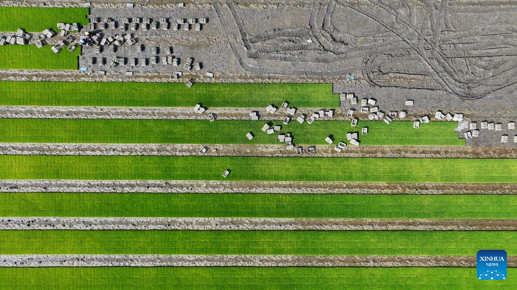 An aerial drone photo taken on May 21, 2025 shows farmers transporting rice seedlings in a field in Fengnan District in Tangshan, north China's Hebei City. The traditional Chinese solar term Xiaoman (Grain Buds) falls on May 21 this year, indicating that grain seeds are becoming full. (Photo by Li Xiuqing/Xinhua)