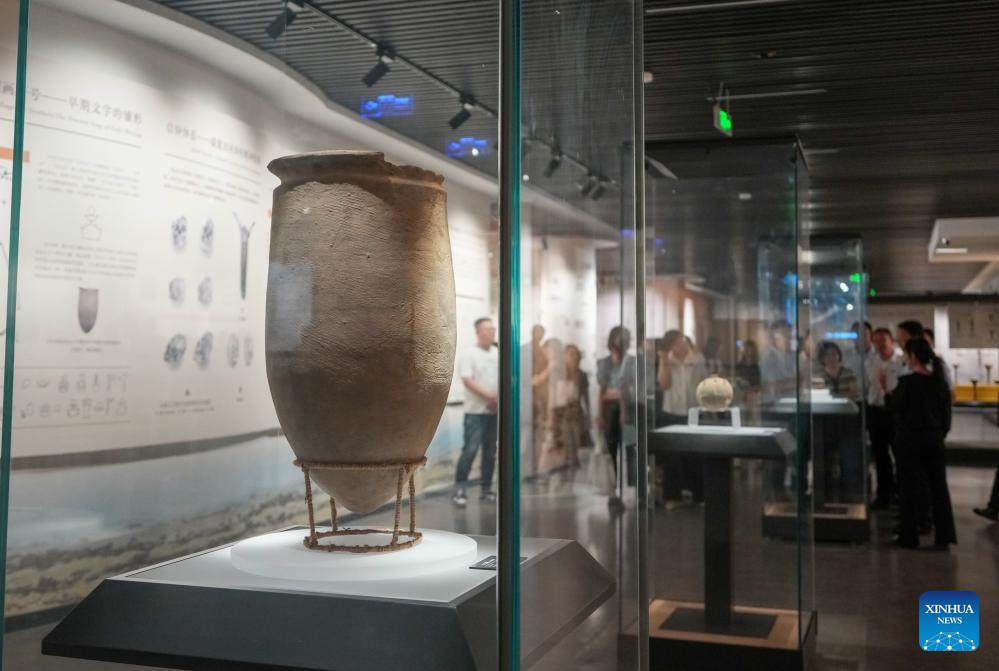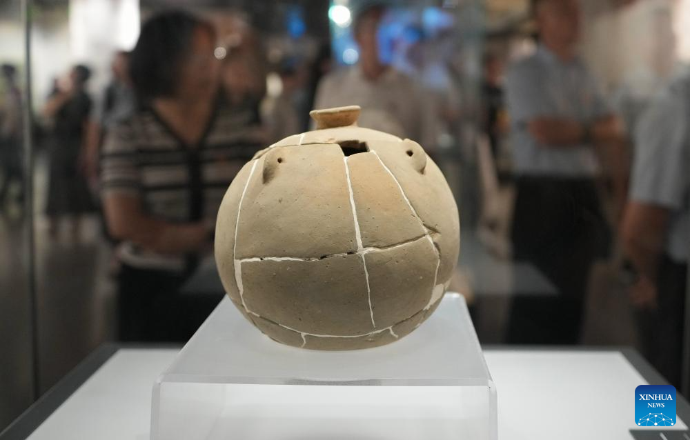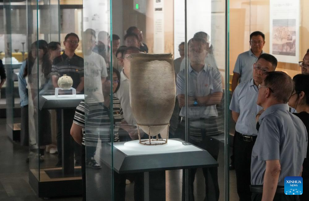 This photo taken on May 20, 2025 shows a pottery pot displayed at the Dawenkou Site Museum in Tai'an, east China's Shandong Province. The 2,600-square-meter Dawenkou Site Museum in Tai'an shows the origin, development, connotation and importance of the Dawenkou Culture (4000 B.C.-2600 B.C.), a culture of the late Neolithic Age, to the public through relics display, scene restoration and multimedia demonstration, etc. (Xinhua/Xu Suhui)