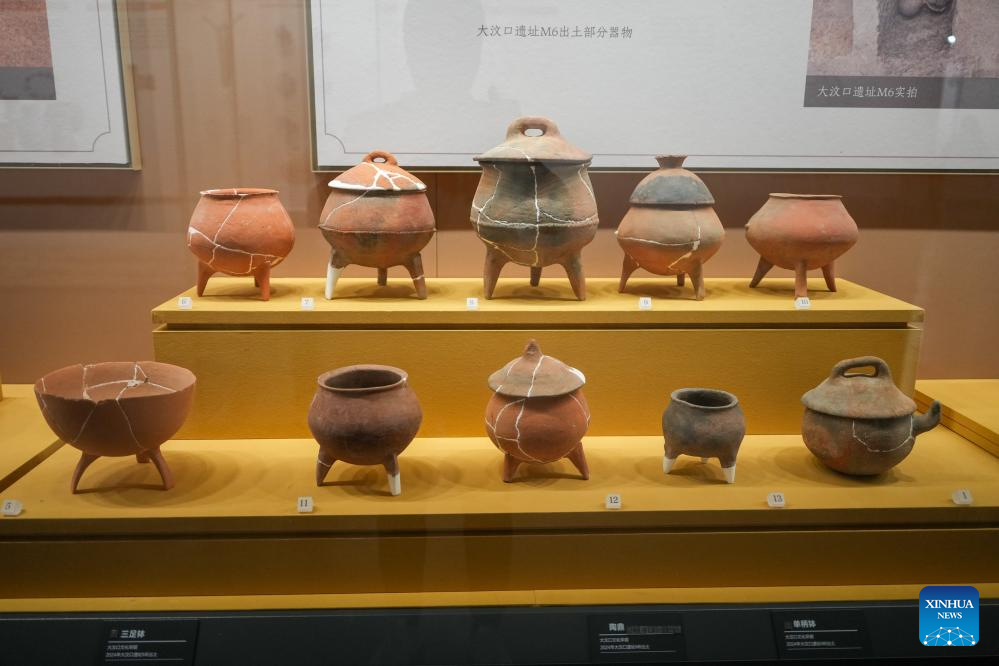 This photo taken on May 20, 2025 shows potteries displayed at the Dawenkou Site Museum in Tai'an, east China's Shandong Province. The 2,600-square-meter Dawenkou Site Museum in Tai'an shows the origin, development, connotation and importance of the Dawenkou Culture (4000 B.C.-2600 B.C.), a culture of the late Neolithic Age, to the public through relics display, scene restoration and multimedia demonstration, etc. (Xinhua/Xu Suhui)
