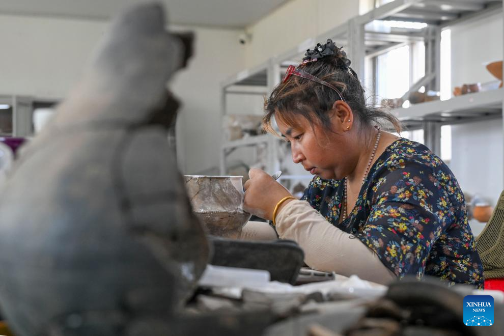 A staff member restores cultural relics at an archaeology workstation of the Dawenkou site in Tai'an, east China's Shandong Province, May 20, 2025. The 2,600-square-meter Dawenkou Site Museum in Tai'an shows the origin, development, connotation and importance of the Dawenkou Culture (4000 B.C.-2600 B.C.), a culture of the late Neolithic Age, to the public through relics display, scene restoration and multimedia demonstration, etc. (Xinhua/Chen Shuo)