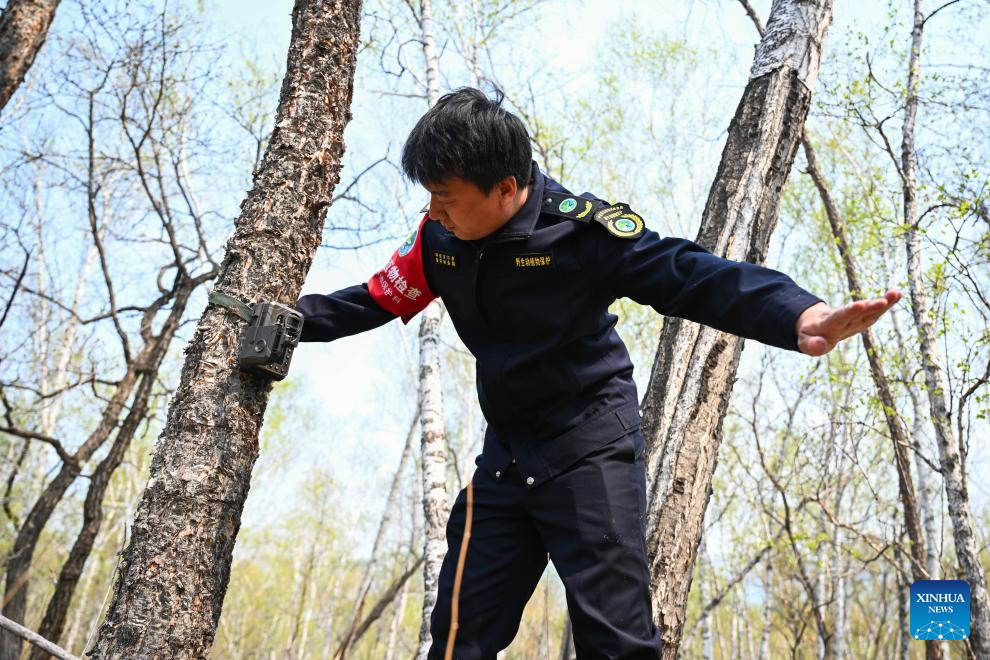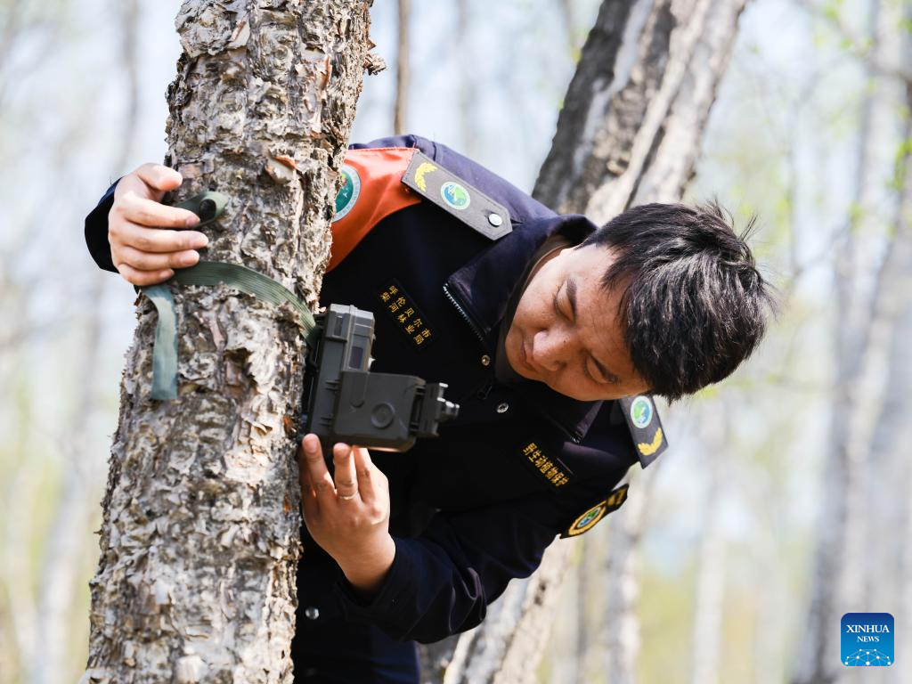 Forest ranger Yi Mingzhe equips a tree with an infrared camera at Chaihekou Forest Farm in Zhalantun City, north China's Inner Mongolia Autonomous Region, May 21, 2025. (Xinhua/Bei He)