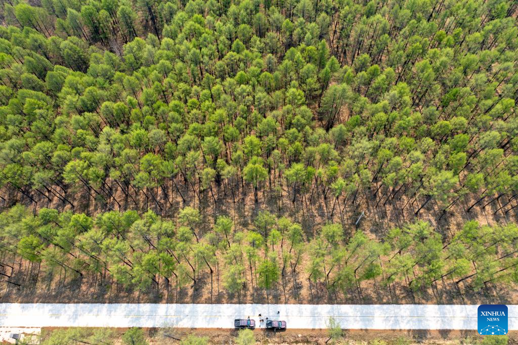 An aerial drone photo taken on May 21, 2025 shows forest rangers conducting patrols at Chaihekou Forest Farm in Zhalantun City, north China's Inner Mongolia Autonomous Region. (Xinhua/Ma Jinrui)