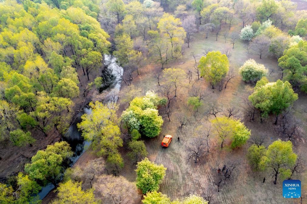 An aerial drone photo taken on May 20, 2025 shows forest rangers patrolling the wild habitat of Amur Cork-trees, a second-class protected plant in China, at Baimaogou Forest Farm in Zhalantun City, north China's Inner Mongolia Autonomous Region. (Xinhua/Ma Jinrui)