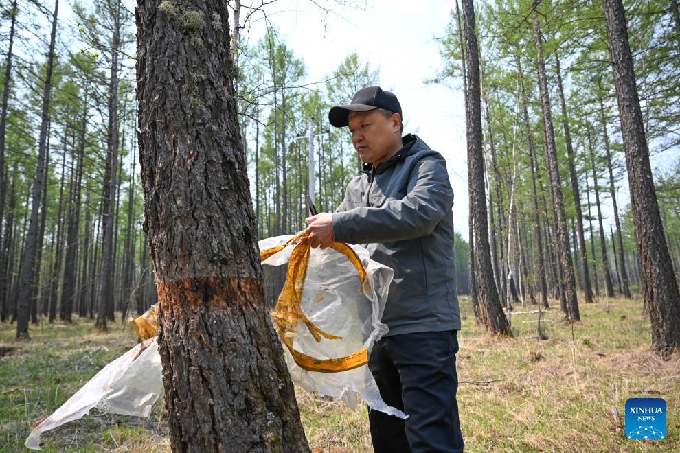 Staff member Pan Chunhua from Chaihe Forestry Bureau removes the tree-mounted shielding at Chaihekou Forest Farm in Zhalantun City, north China's Inner Mongolia Autonomous Region, May 21, 2025. (Xinhua/Bei He)