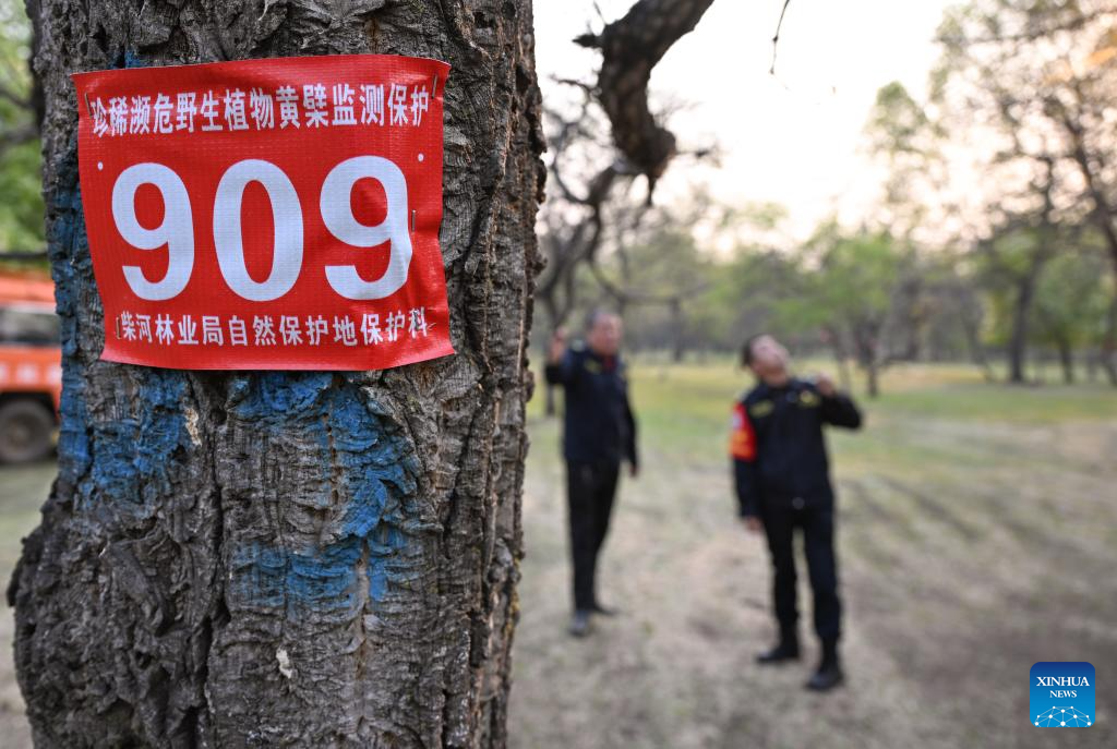 Forest ranger Cao Haihong (L) and his colleague monitor growth conditions of an Amur Cork-tree, a second-class protected plant in China, at Baimaogou Forest Farm in Zhalantun City, north China's Inner Mongolia Autonomous Region, May 20, 2025. (Xinhua/Bei He)