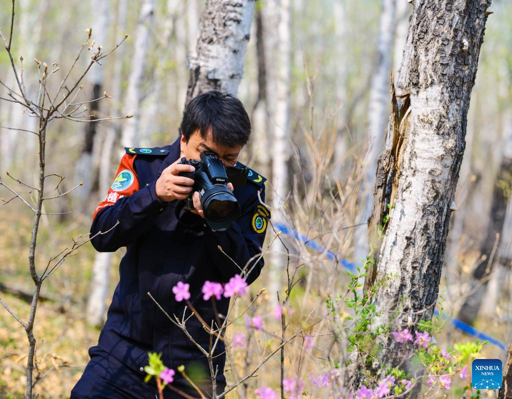 Forest ranger Yi Mingzhe takes photos of wild rhododendrons at Chaihekou Forest Farm in Zhalantun City, north China's Inner Mongolia Autonomous Region, May 21, 2025. (Xinhua/Zhang Kun)